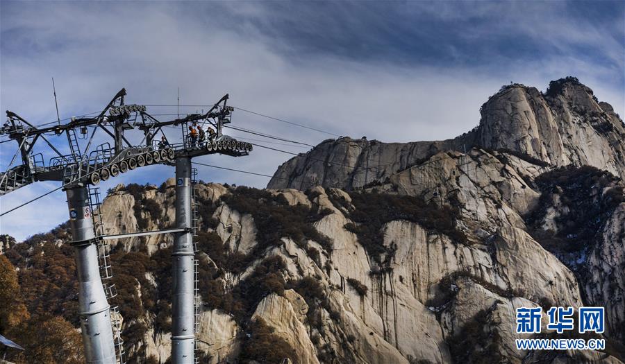 华山太华索道维修人员在进行索道支架横担检测(12月5日无人机拍摄)。 新华社记者陶明摄