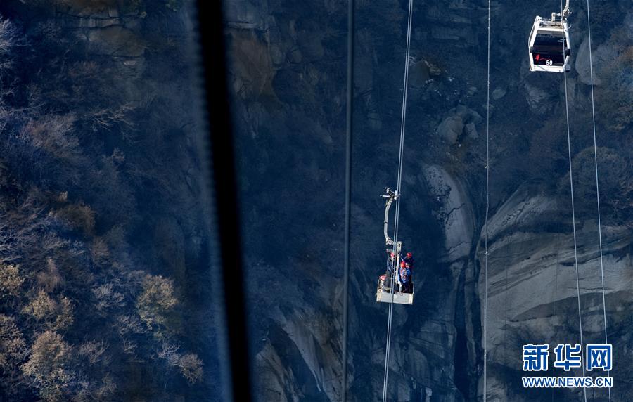 华山太华索道检修人员在进行承载索调试(12月6日摄)。 新华社记者陶明摄