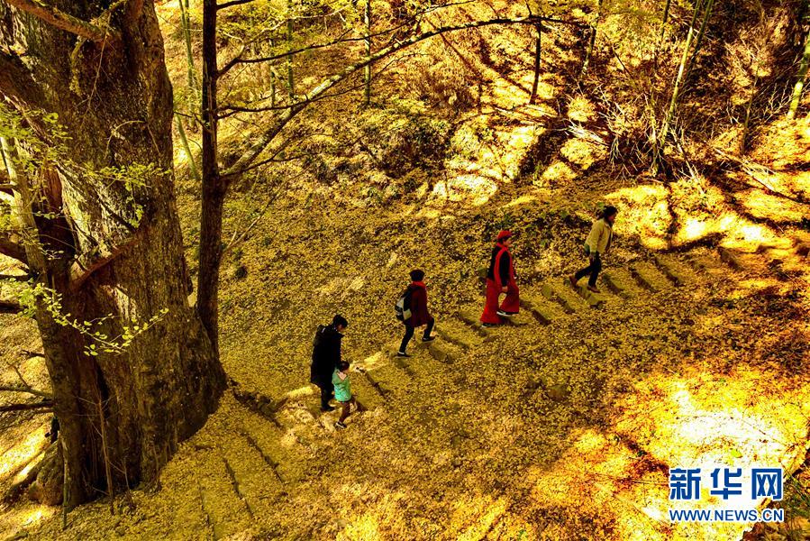 12月8日,游客在政和县铁山镇大岭村游览。冬日,福建省政和县铁山镇大岭村的银杏树叶一片金黄,美不胜收。新华社记者 张国俊 摄
