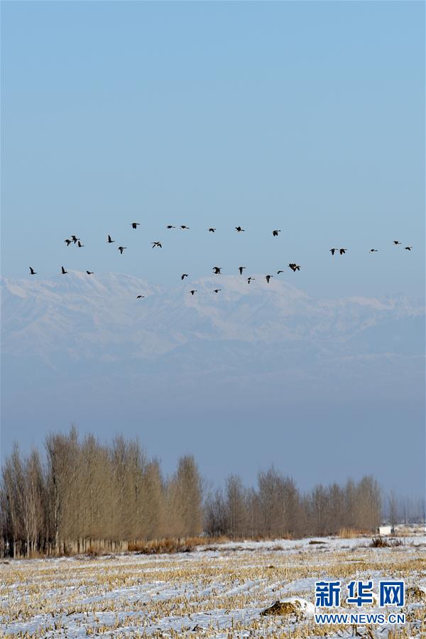 12月18日,来到察布查尔锡伯自治县越冬的豆雁在天空飞翔。新华社记者丁磊摄