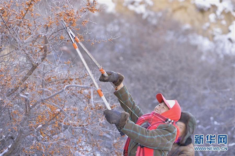 12月18日,当地群众在清水河县野生沙棘保护地采摘沙棘果。