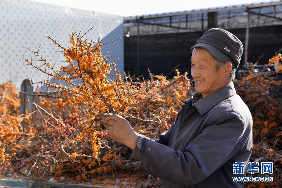 12月18日,当地群众在展示沙棘果。 新华社记者 徐钦 摄