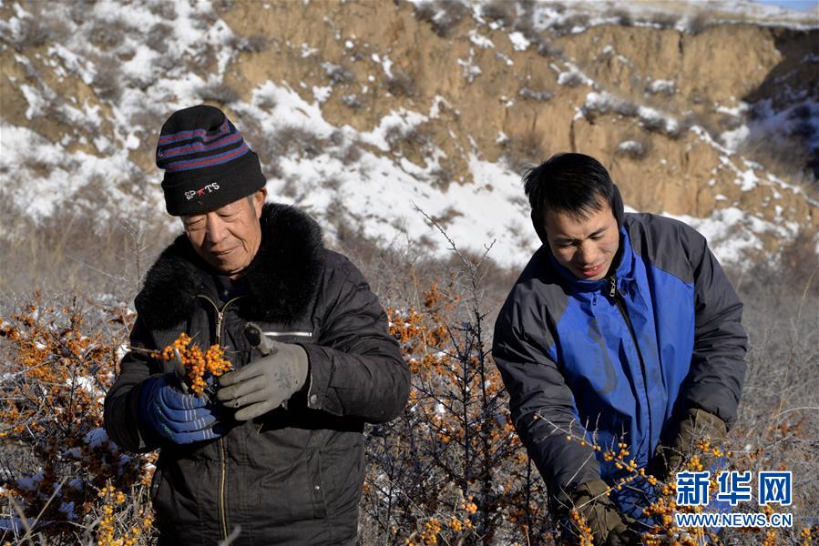 12月18日,当地群众在清水河县野生沙棘保护地采摘沙棘果。 新华社记者 徐钦 摄