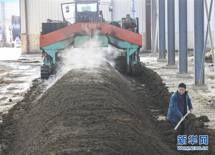 12月19日,河北省永清县里澜城镇兰星牧业奶牛基地工人将粉碎的枝条和牛粪混合发酵。新华社记者 李晓果 摄