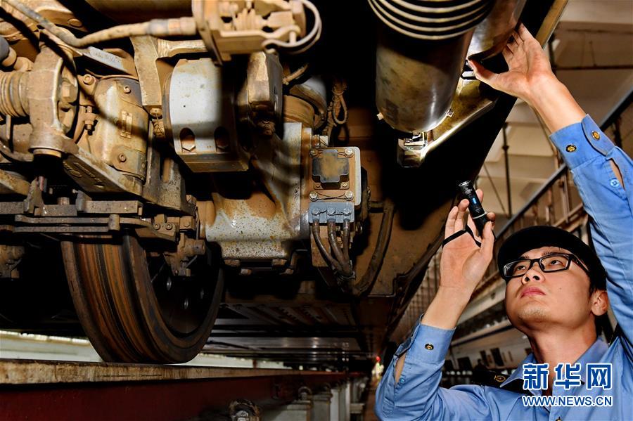 12月19日,福州动车段地勤机械师在检查动车组列车车底。新华社记者张国俊摄