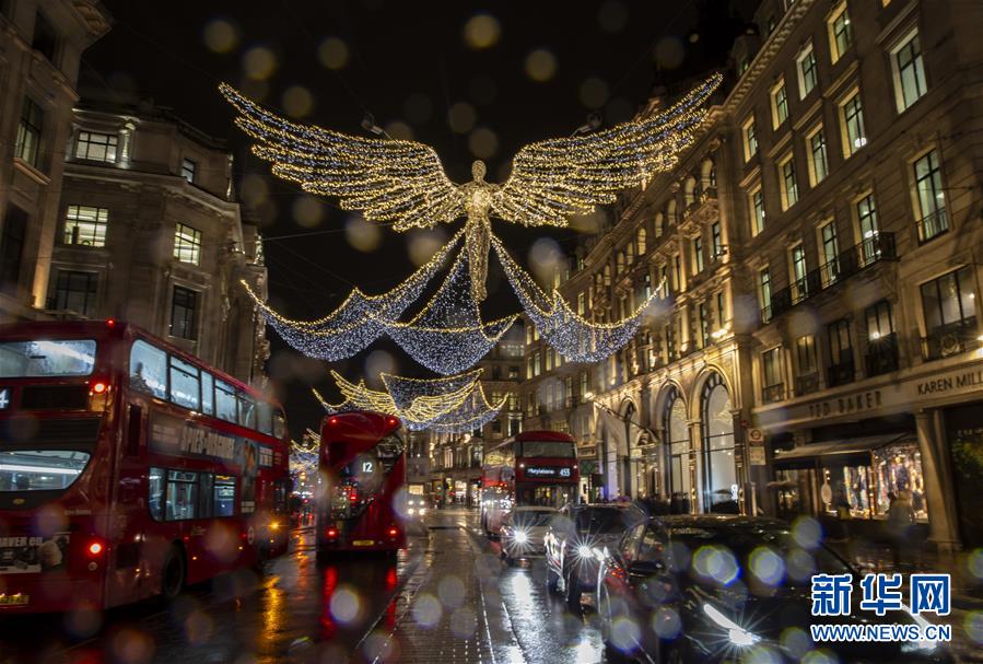 12月18日,在英国伦敦,车辆从摄政街的彩灯下经过。 新华社记者 韩岩 摄
