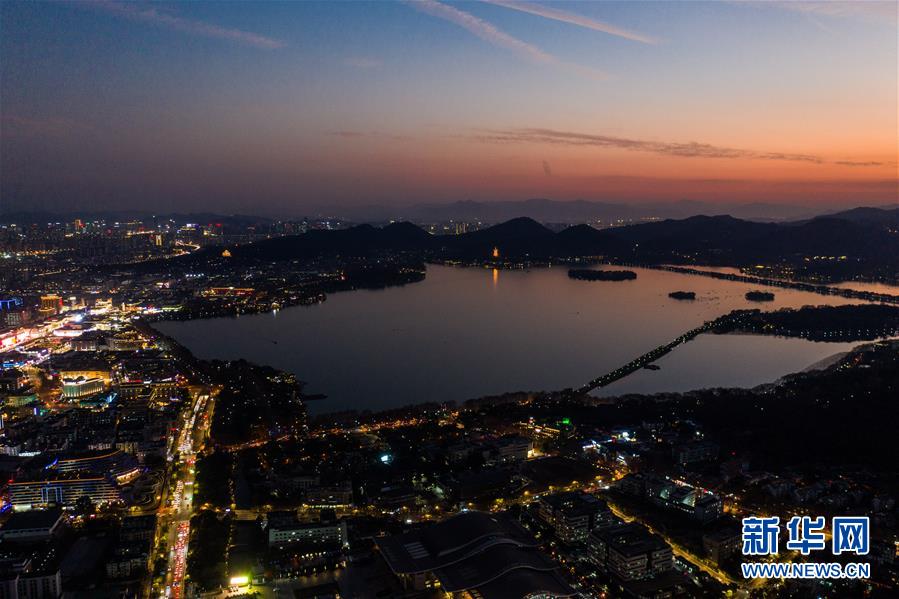 1月6日,绚丽晚霞映照杭州西湖(无人机照片)。 新华社记者 徐昱 摄