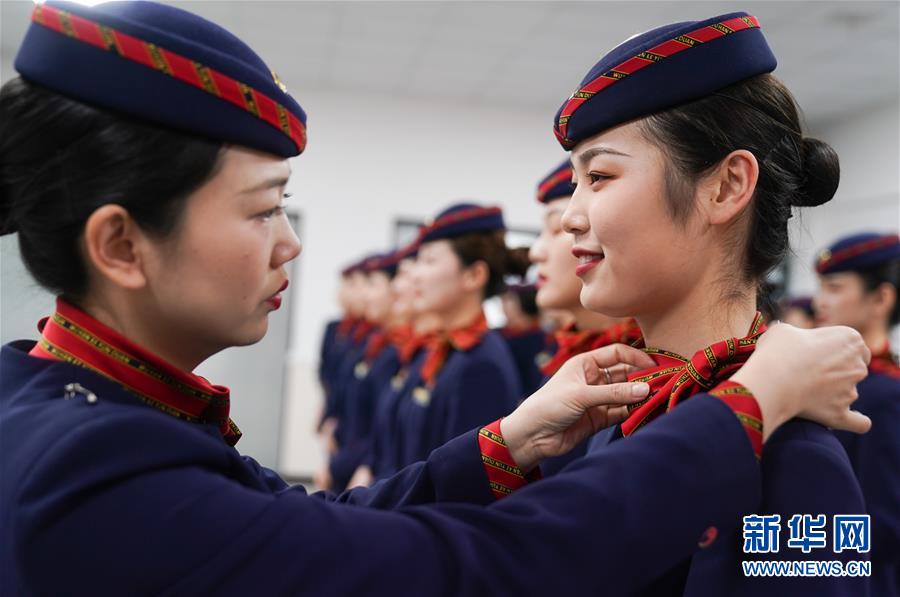 1月6日,新入职的乘务员余艳阳(右)在接受培训。