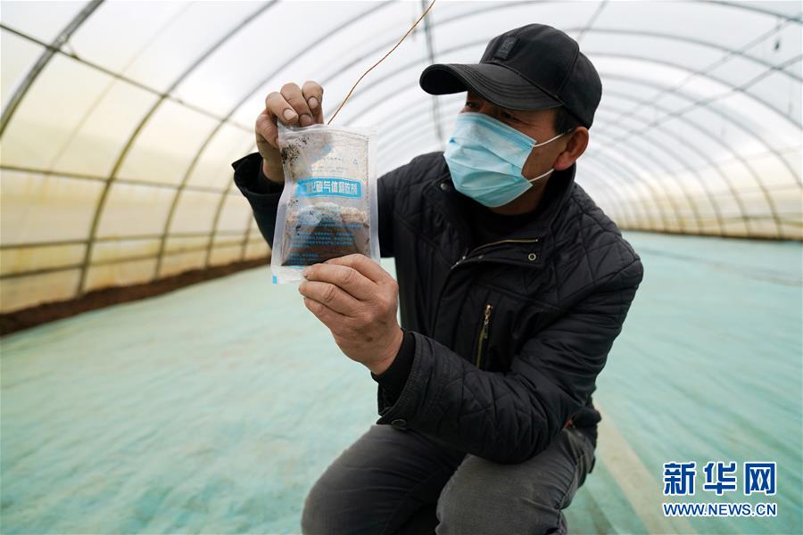 4月22日,在黑龙江省五常市民意乡前进村的一处水稻育苗基地大棚中,管理人员查看二氧化碳气体释放剂。