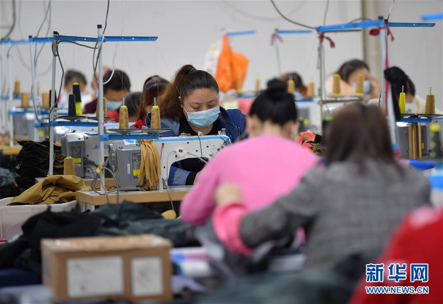 4月21日,在湖北省恩施土家族苗族自治州一家服饰有限公司,工人正在制作冲锋衣。