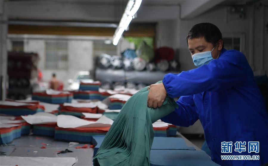4月21日,在湖北省恩施土家族苗族自治州一家服饰有限公司,工人正在整理布料。