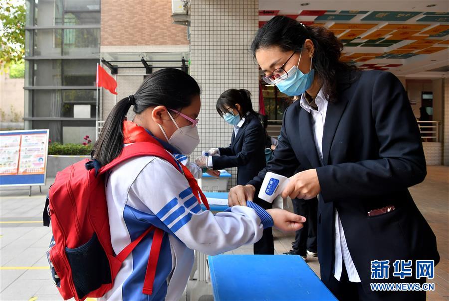 4月27日,陕西师范大学锦园小学的学生在进校前接受体温测量。 当日,陕西省西安市小学4至6年级学生开学复课。 新华社记者 刘潇 摄