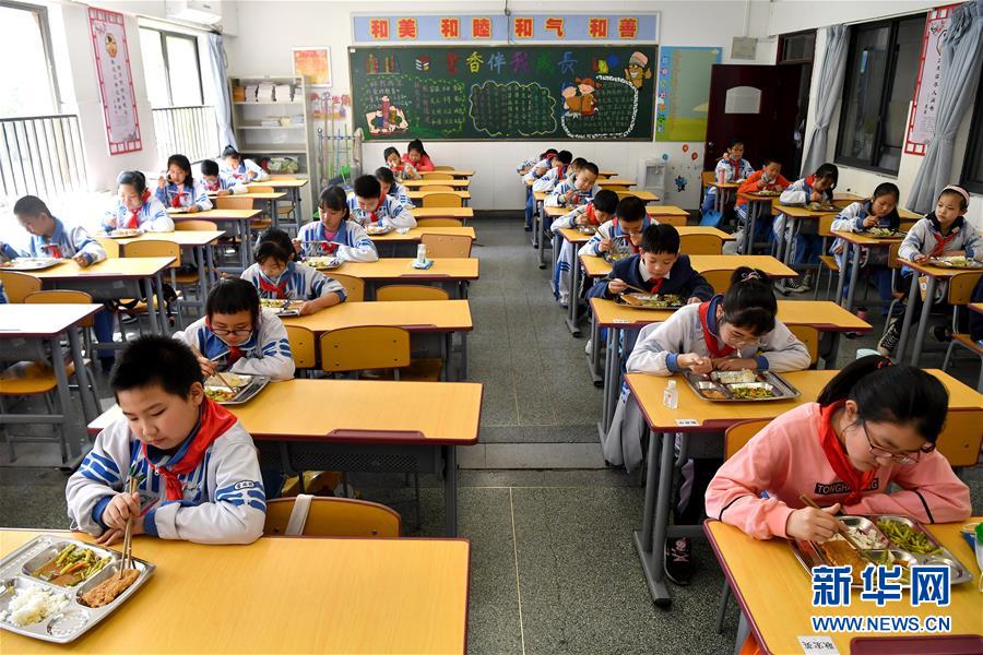 4月27日,陕西师范大学锦园小学的学生在吃午餐。 当日,陕西省西安市小学4至6年级学生开学复课。 新华社记者 刘潇 摄