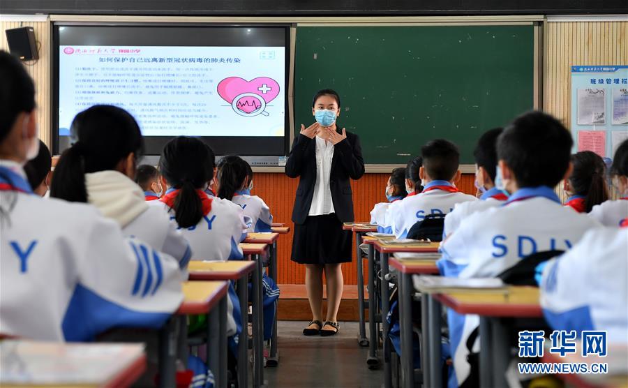 4月27日,陕西师范大学锦园小学的老师在开学第一课上为学生讲解防疫知识。 当日,陕西省西安市小学4至6年级学生开学复课。 新华社记者 刘潇 摄