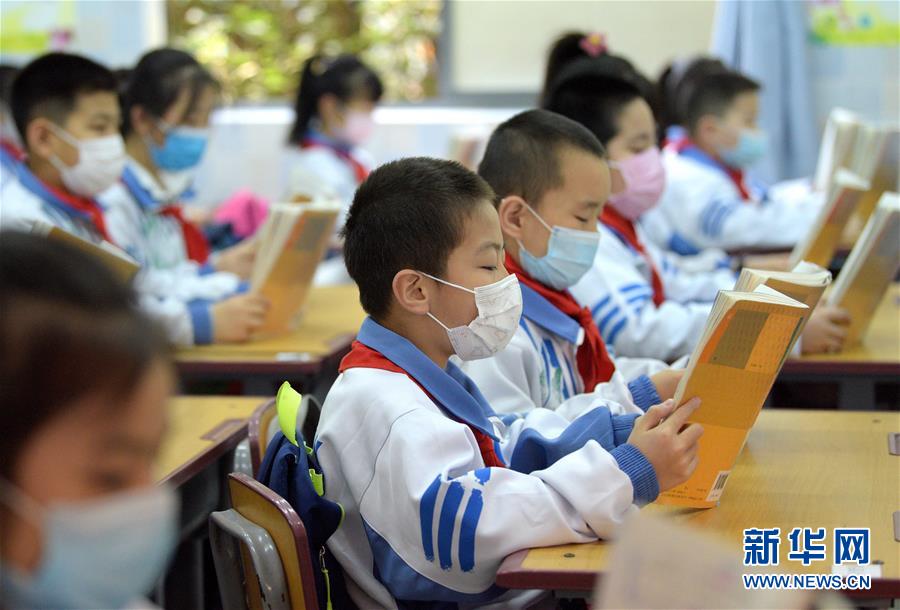 4月27日,陕西师范大学锦园小学的学生在早读。 当日,陕西省西安市小学4至6年级学生开学复课。 新华社记者 刘潇 摄