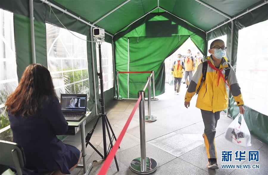 4月27日,在位于成都市青羊区的西南财经大学附属小学,学生经测温通道入校。 当日,成都市小学五六年级开学复课。 新华社记者 刘坤 摄