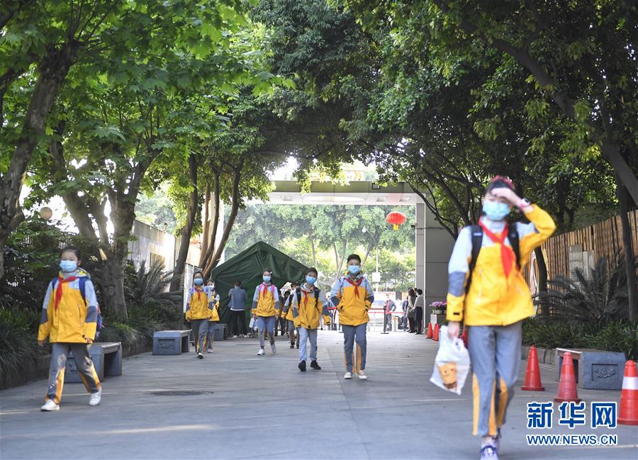 4月27日,在位于成都市青羊区的西南财经大学附属小学,学生步入校园。 当日,成都市小学五六年级开学复课。 新华社记者 刘坤 摄