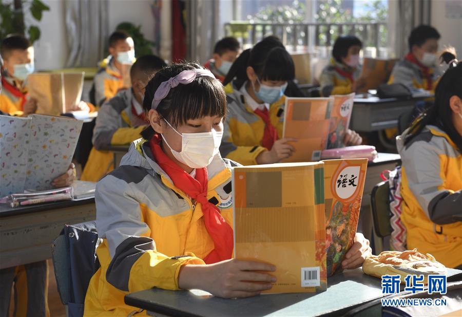 4月27日,在位于成都市青羊区的西南财经大学附属小学,学生正在早读。 当日,成都市小学五六年级开学复课。 新华社记者 刘坤 摄