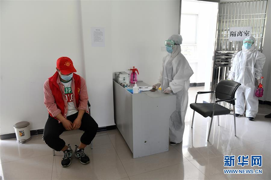 4月27日,湖北省宜昌市秭归县第一中学参加模拟演练的高三年级老师在模拟演练安置“发热学生”。新华社发(王辉富 摄)