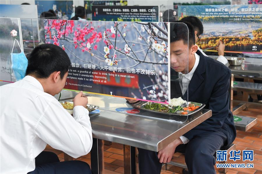 4月27日,在深圳外国语学校初中部食堂,初三学生间隔就餐。 当日,深圳初三高三年级学生返校开学。 新华社记者 梁旭 摄