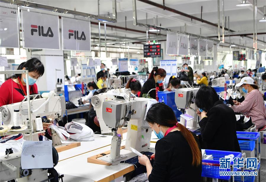 4月27日,在莆田市一家出口鞋企生产线上,工人们在抓紧生产。