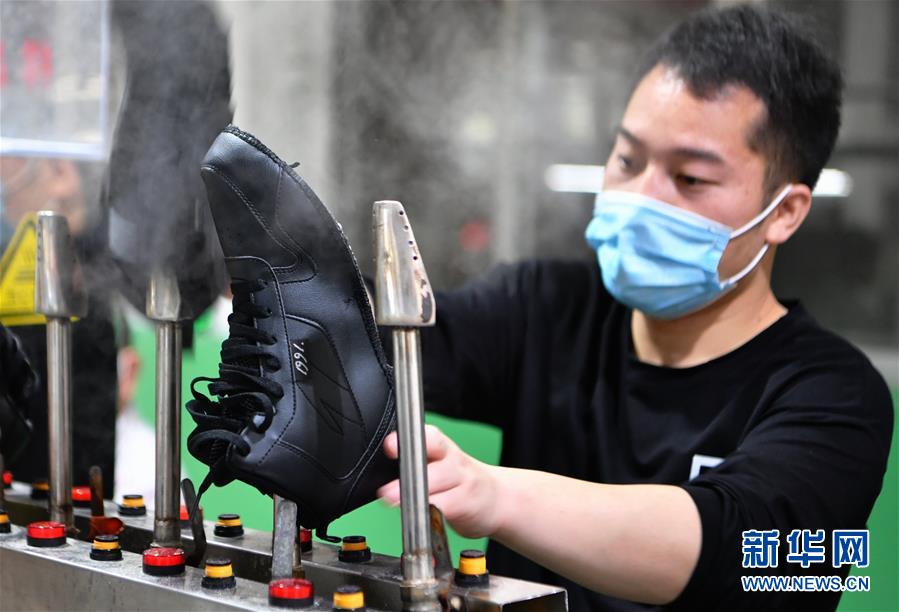 4月27日,在莆田市城厢区的一家鞋企生产线上,工人使用蒸湿软化机对鞋子进行鞋面蒸湿。