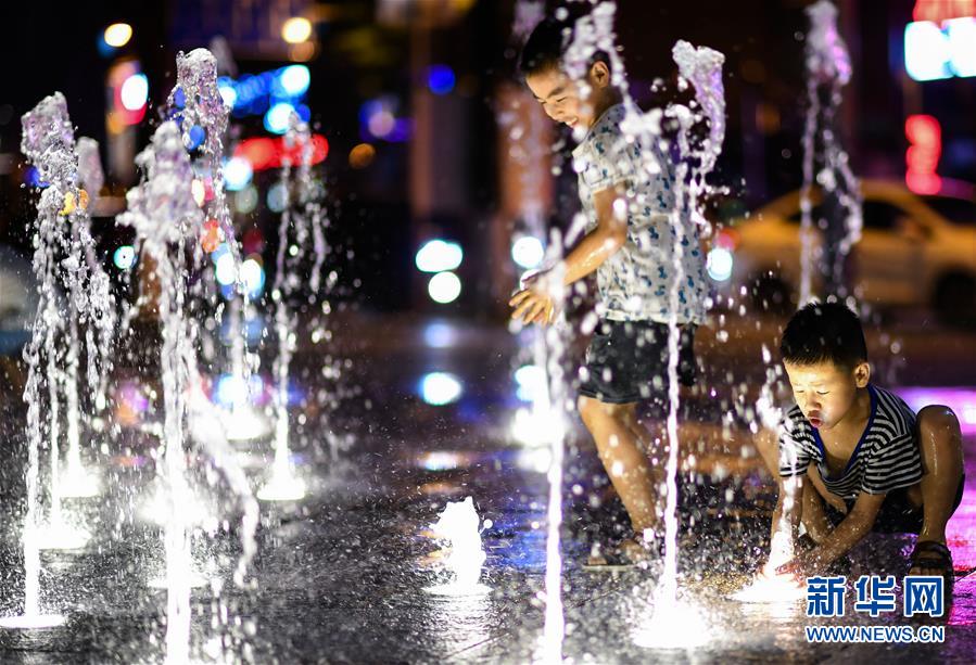 小朋友在广州鹤洞路一处小型喷泉玩耍(5月4日摄)。