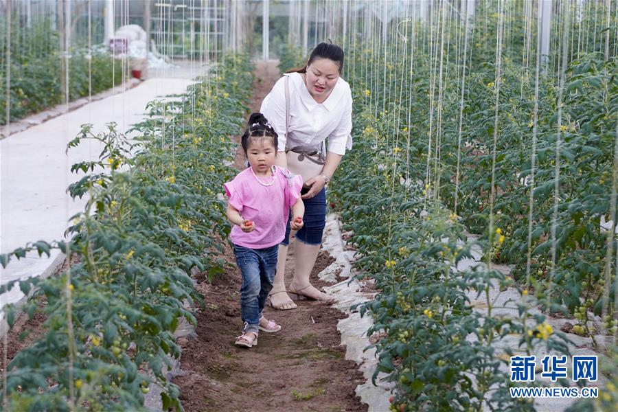 5月4日,在重庆数谷农场大棚内,一对母女在体验采摘番茄的乐趣。