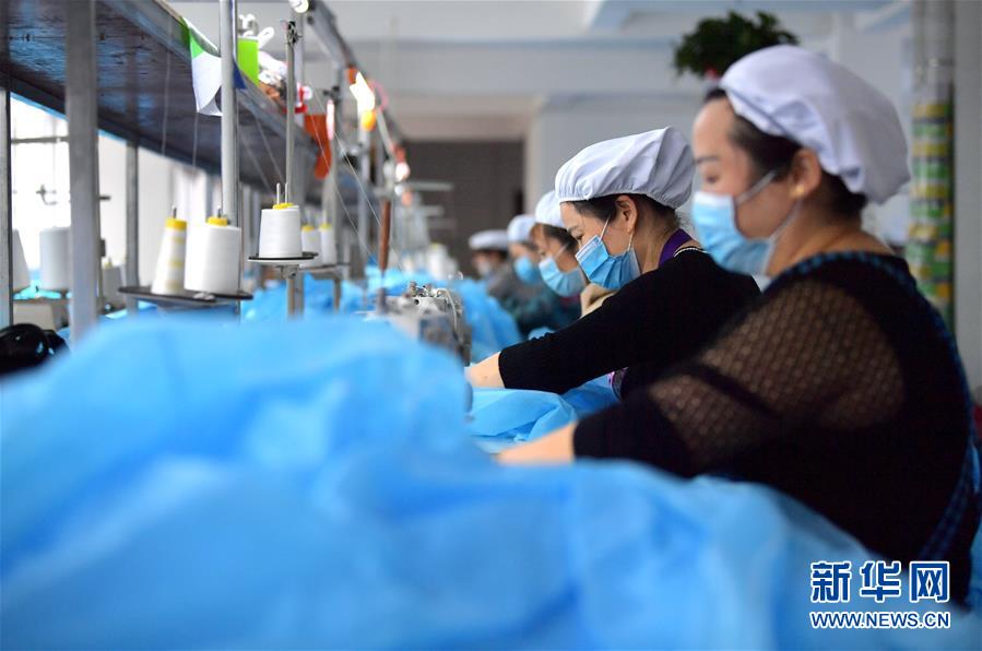 5月5日,就业农民在生产线上加工一次性隔离服。 时下,湖北省恩施土家族苗族自治州宣恩县珠山镇甘溪易地扶贫搬迁安置点的一家公司,组织就业农民按照订单需求赶制一次性隔离服,带动安置点及周边农民就业增收。 新华社发(宋文 摄)