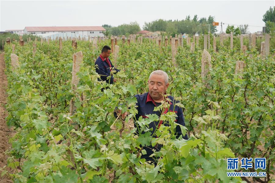 初夏时节,河北省昌黎县5万多亩酿酒葡萄进入关键管理期,果农抢抓农时对酿酒葡萄进行定杆、掐蔓、定果等田间管理。 新华社记者 杨世尧 摄