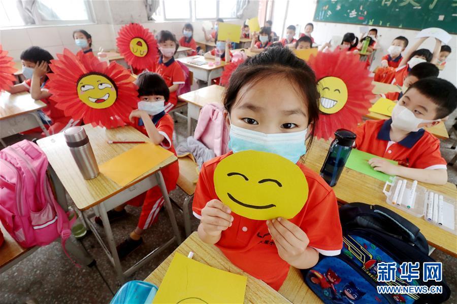 5月7日,在湖南省涟源市桥头河镇大屋联校,孩子们展示自己制作的笑脸。