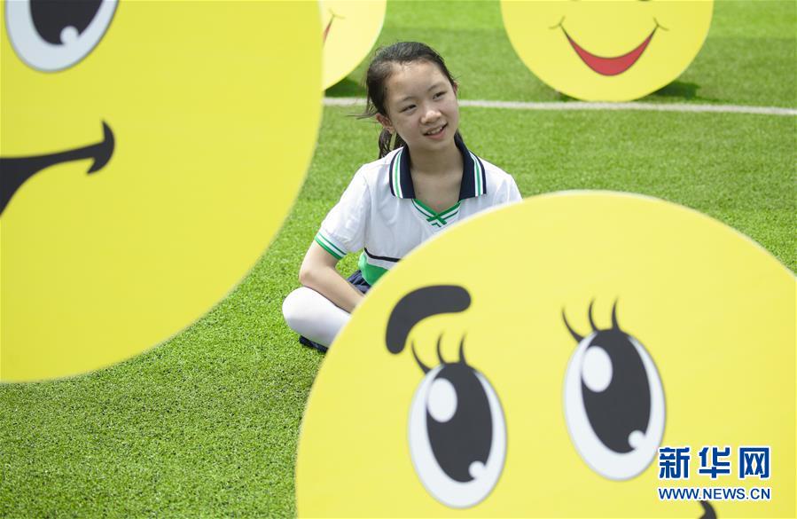 5月7日,在湖南省东安县舜德学校,学生们在操场上摆出笑脸造型。
