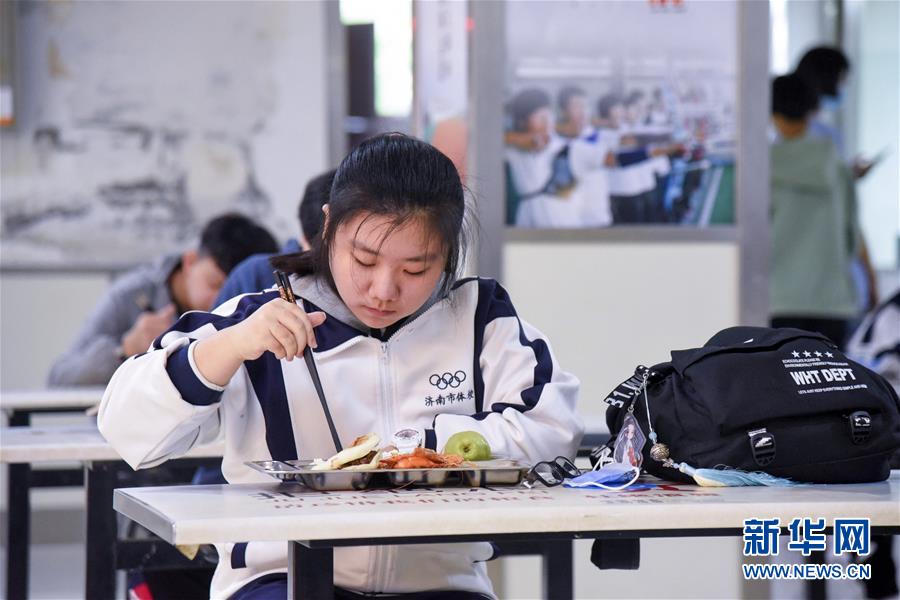 5月8日,山东省济南市体育运动学校学生王长涌在食堂与其他同学间隔就餐。