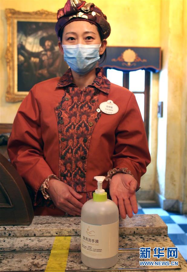 5月8日,上海迪士尼乐园在园区景点、餐厅和商店为入园游客提供免洗洗手液。