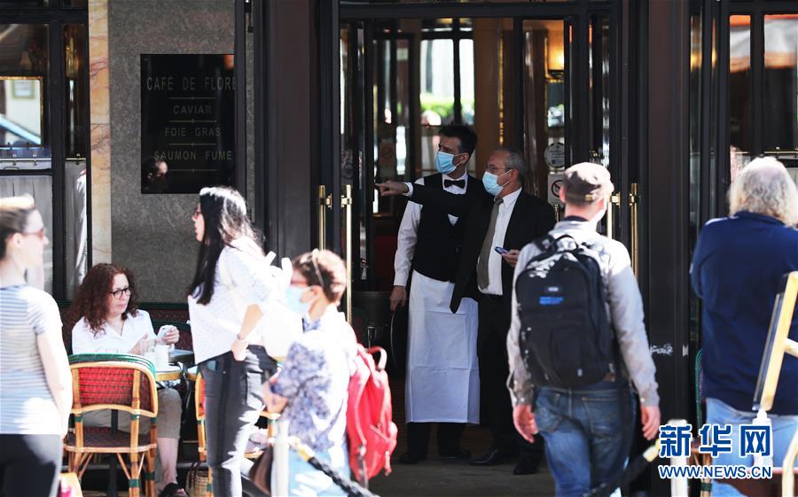 6月2日,在法国巴黎,人们在花神咖啡馆外排队等待。 法国6月2日起进入解禁第二阶段,全国除法兰西岛大区、海外属地马约特岛和法属圭亚那为“橙色区域”外,其余地区均为疫情较轻的“绿色区域”。自2日起,餐馆、酒吧等可重新开门营业,但位于“橙色区域”的餐馆和酒吧仅可开放室外座位,禁止在室内用餐。 新华社记者 高静 摄