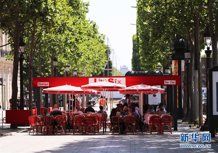 6月2日,在法国巴黎香榭丽舍大街,人们在一家餐馆的户外区域吃午餐。 法国6月2日起进入解禁第二阶段,全国除法兰西岛大区、海外属地马约特岛和法属圭亚那为“橙色区域”外,其余地区均为疫情较轻的“绿色区域”。自2日起,餐馆、酒吧等可重新开门营业,但位于“橙色区域”的餐馆和酒吧仅可开放室外座位,禁止在室内用餐。 新华社记者 高静 摄