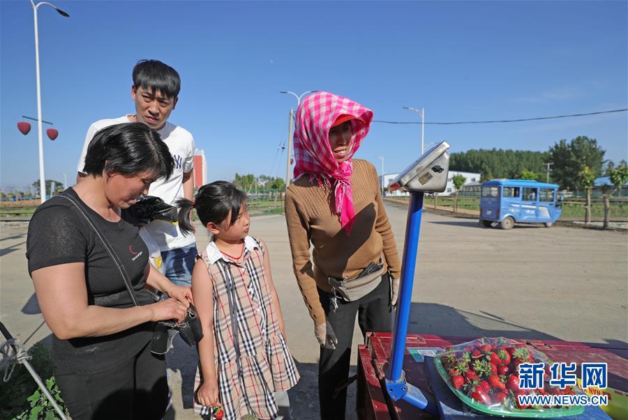 6月1日,来前杜村采摘的游客向村民购买草莓。新华社记者杨青摄