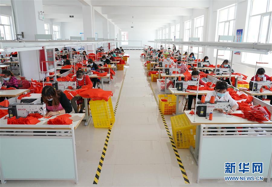6月2日,工人在尚义县大青沟镇的易地扶贫搬迁集中安置小区附近一家扶贫工厂工作。