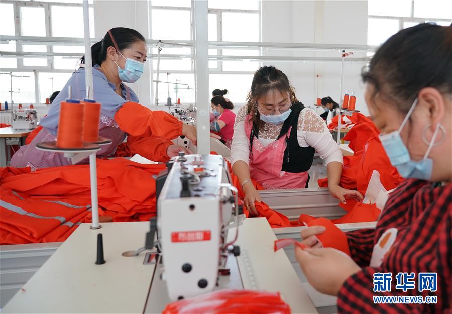 6月2日,工人在尚义县大青沟镇的易地扶贫搬迁集中安置小区附近一家扶贫工厂工作。新华社记者 杨世尧 摄