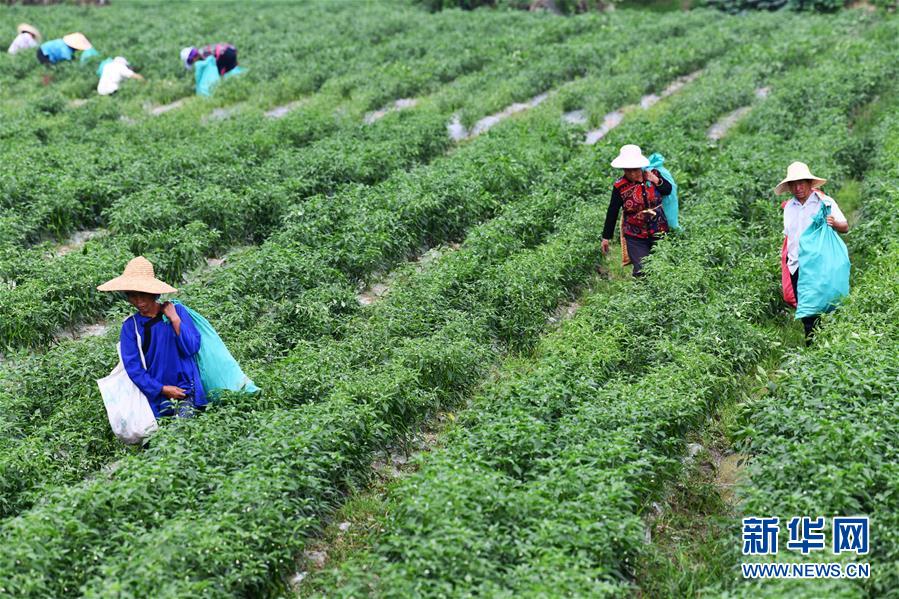 6月2日,农民在贵州省榕江县车江坝区采收辣椒。 贵州省黔东南苗族侗族自治州榕江县是国家扶贫开发工作重点县,也是贵州省目前尚未脱贫摘帽的9个县之一。今年以来,榕江县通过流转车江坝区土地,充分利用坝区地势平坦、土壤肥沃、气候温和、交通便利等优势,大力推进辣椒、西红柿、茄子、百香果等规模化订单农业种植,吸收当地群众从事种植、管理、采收等工作,助农脱贫增收。 新华社记者 杨文斌 摄