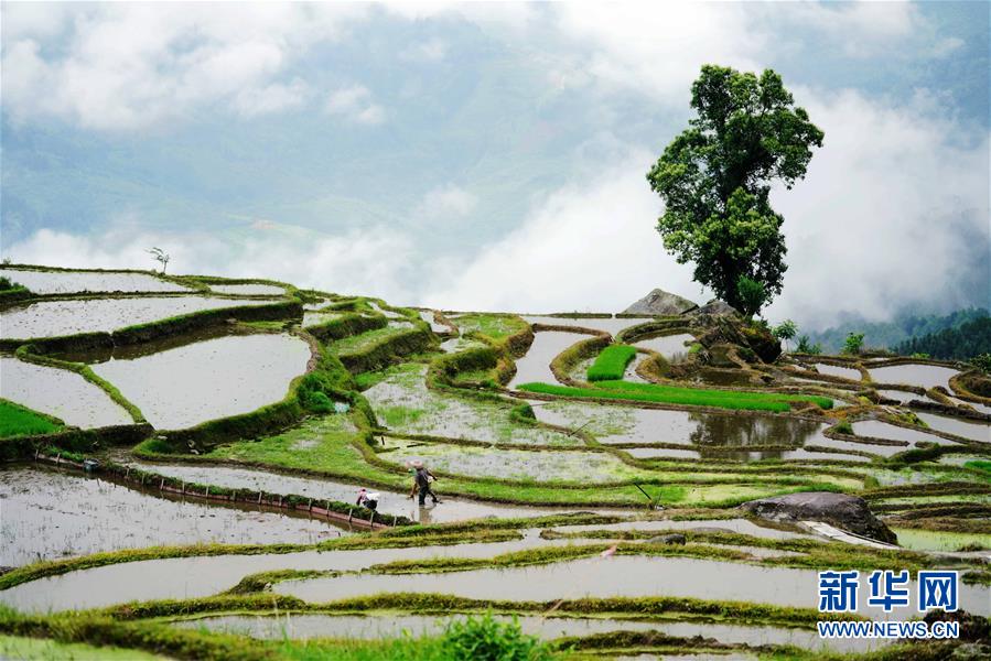 6月2日,广西龙胜各族自治县泗水乡泗水村小岩底苗寨的农民在梯田里劳作(无人机照片)。