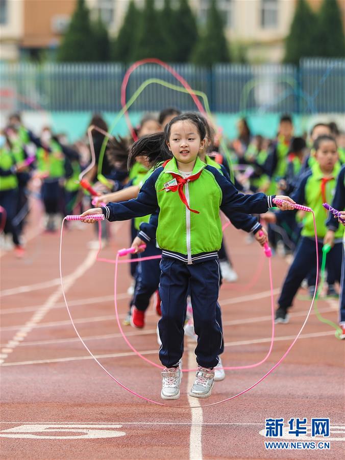 6月2日,在山东省荣成市第二实验小学的操场上,小学生们在跳绳。 伴随着学生们的返校复课,各地中小学幼儿园的操场又热闹起来。学校在做好防控措施的同时,保证学生们的体育锻炼时间,引导学生恢复体能、放松心情。 新华社发(李信君 摄)