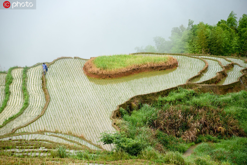 2020年6月7日下午,江西省吉安市遂川县大汾镇桃坪村,大雨过后,风起雾涌,深山梯田,如诗如画,美不胜收。
