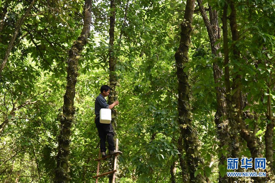 6月8日,村民在树上采摘铁皮石斛花。 近年来,贵州省安龙县者贵村利用当地气候和森林资源优势,发展中药材铁皮石斛种植,通过就近务工、产业分红等方式带动群众增收。目前,安龙县的铁皮石斛种植面积达6000余亩。 新华社记者 施钱贵 摄
