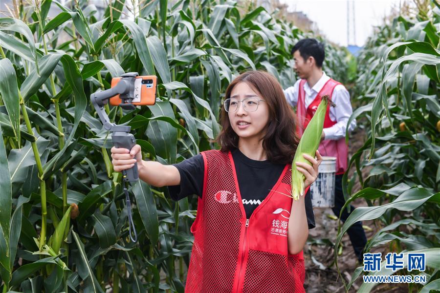6月8日,志愿者在田间通过直播展示刚采摘下来的玉米。 当日,浙江省慈溪市钱海军志愿服务中心的志愿者们来到慈溪市崇寿镇海运村,帮助与该中心结对的低保户老人,一起收获地里成熟的玉米,并通过线上直播、线下设摊的形式进行义卖。近期,浙江省慈溪市钱海军志愿服务中心举办多次爱心助农活动,组织青年志愿者到农村帮助孤寡老人、低保户、残疾农户采收蔬菜、水果并进行义卖。 新华社记者 徐昱 摄