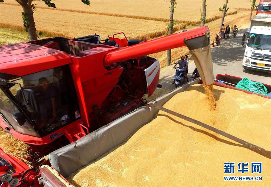 6月8日,在河北省南和县闫里乡闫里村,农民将收获的小麦装车(无人机照片)。 “三夏”期间,河北省预计组织和调度小麦联合收割机、拖拉机、夏玉米播种机等200万台农业机械投入作业。 新华社记者 朱旭东 摄