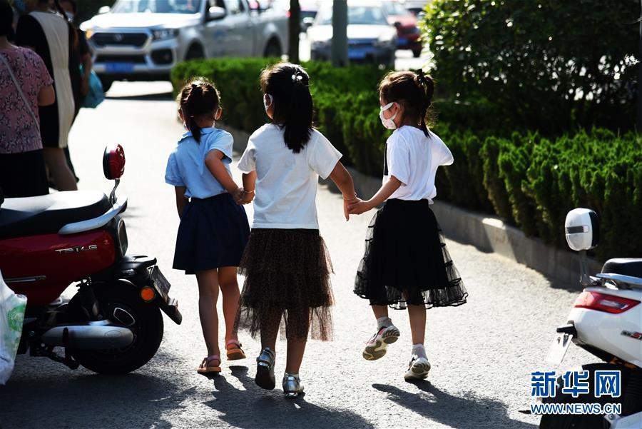 6月8日,济南市济水上苑幼儿园的小朋友入园。 当日,济南市各幼儿园在严格进行疫情防控的基础上复园。 新华社记者王凯摄