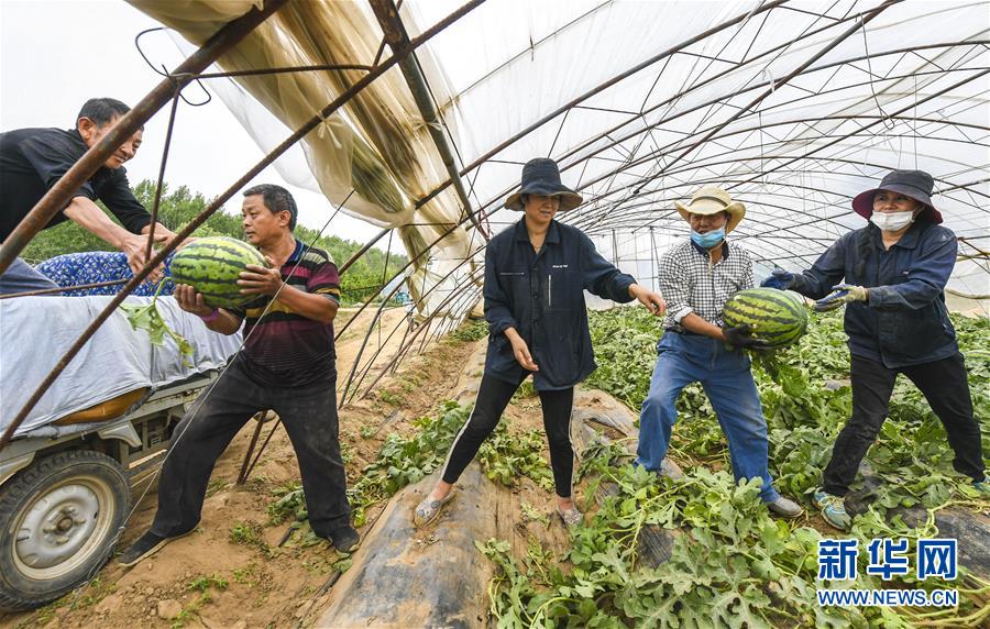 6月9日,在河北省大厂回族自治县祁各庄镇洼子村,村民在搬运西瓜。 近日,河北省大厂回族自治县祁各庄镇洼子村400亩西瓜迎来收获季。洼子村地处潮白河畔,沙质土适宜西瓜生长,村里成立了专业合作社,并为西瓜注册了“洼子”的商标,成为远近闻名的特色种植专业村。 新华社记者李晓果摄