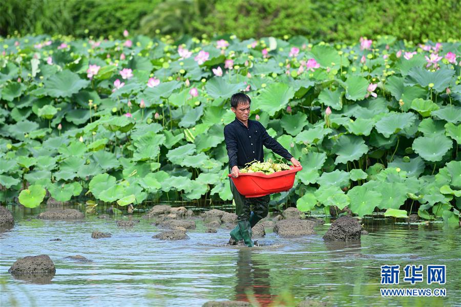 6月9日,村民在海口龙华区龙泉镇椰子头村搬运采摘的莲蓬。