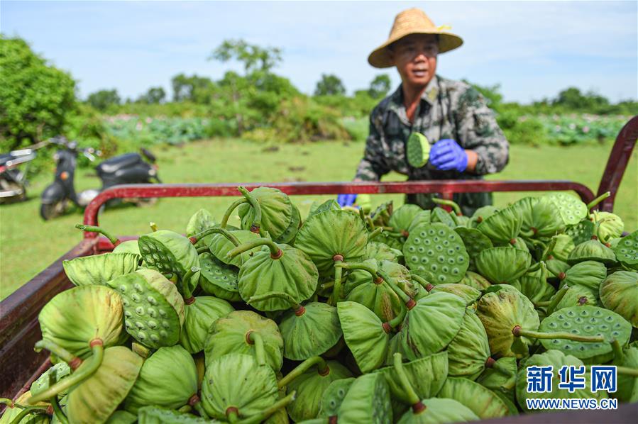 6月9日,村民在海口龙华区龙泉镇椰子头村分拣采摘的莲蓬。
